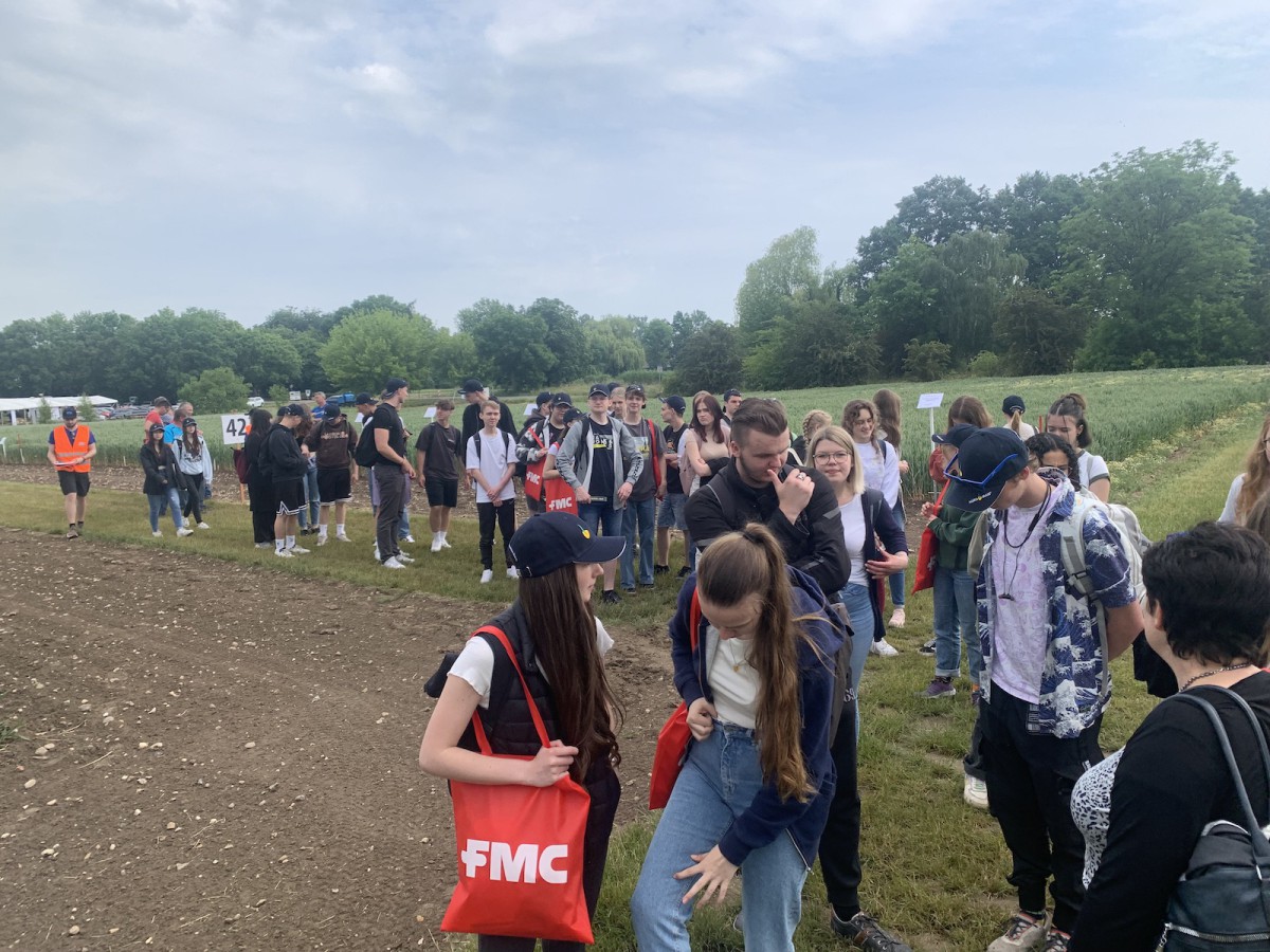 Direkt neben den Feldanlagen des SKW´s waren viele Stände zu den Themen Düngung, Pflanzenschutz, Saatgut und Agrartechnik aufgebaut. Frau Dorn begleitete uns bei einer Führung durch die Felder. Dabei erhielten wir an verschiedenen Stationen Einblicke in die Vor- und Nachteile von chemischen Pflanzenschutzmitteln und die Entwicklung von Dünger. Des Weiteren beschäftigten wir uns mit der Geschichte der Agrarwirtschaft sowie dem Einfluss von verschiedenen Wetterlagen auf die Wirkungsweise der Düngemittel.