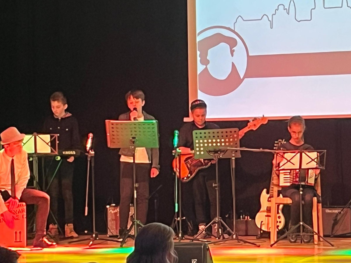 Am vergangenen Freitag, dem 17.03.2023, traf sich die Nachwuchsband der Fachschaft Musik pünktlich 15:30 Uhr zu einem professionellen Soundcheck im großen Saal des Stadthauses Wittenberg. Bereits in diesem Moment konnten die Schülerinnen und Schüler der 5. bis 9. Klasse ihre ersten auftrittstypischen Erfahrungen sammeln: Der Techniker hatte für sie bereits die Instrumente und Mikrofone aufgebaut und verkabelt, so dass sie nur noch auf die Bühne gehen und für eine finale Probe musizieren mussten. Auch, dass alle Gitarren, die Cajon und die Tasteninstrumente über die große Anlage liefen und man sich sogar selbst über die Monitorboxen hören konnte, war für die jungen Leute völlig neu. Nach 30 Minuten hieß es dann warten im Backstagebereich, mit bereitgestellten Getränken und bequemen Sitzgelegenheiten, wobei aber die Aufregung doch schwer zu beherrschen war.