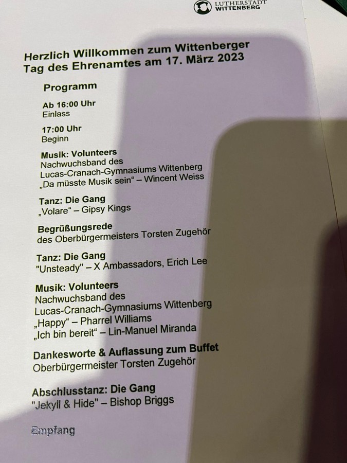 Um Punkt 16:55 Uhr betrat die Nachwuchsband des Lucas-Cranach-Gymnasiums mit dem selbst gewählten Namen Volunteers die Bühne, vor der bereits 300 geladene Gäste warteten, um den Tag des Ehrenamtes in Wittenberg musikalisch zu eröffnen. Was in der Generalprobe noch nicht rhythmisch übereinander passen wollte und die Stellen, an denen die Band manchmal in eine Gruppe von Einzelkämpfern zu zerfallen drohte, funktionierte jetzt, wo es darauf ankam, tadellos. „Da müsste Musik sein“ hörte man von Florian König und Julia Janocha interpretiert und musikalisch abwechslungsreich gestaltet durch den Saal schallen, was der Oberbürgermeister Herr Zugehör direkt im Anschluss bei seiner Begrüßung mit viel Lob bedachte. Nach einer 20-minütigen Wartezeit, in der im Programm eine Tanzgruppe um unsere ehemalige Abiturienten Emily Kosa den Abend bereicherte, spielte unser Nachwuchs die Titel „Happy“ von Pharrell Williams und zum Dritten den Disney-Song „Ich bin bereit“, bei denen sich Patrik Vazny mit seiner klaren Stimme präsentieren konnte. Ob nun die Basslinie bei Fritz Geue auf dem E-Bass oder das rhythmische Fundament auf der Trommelbox gespielt von Leopold König, die hawaiianischen Klänge auf dem Keyboard aus den Händen von Arik Michelsson oder die füllenden Chords von Akkordeon (Maria Czubera), E-Gitarre (Tim Gerngross) und Piano (Max Schmidt)- alle musizierten wie ein schon lange eingespieltes Team, was auch den ehrenamtlichen im Saal positiv auffiel und mit viel Applaus bedacht wurde. Der Oberbürgermeister ließ es sich nicht nehmen und zitierte alle noch einmal auf die Bühne, um sie namentlich und mit Funktion vorzustellen. Das war ein ganz besonderer Moment, war es doch auch der erste Auftritt in einem solchen offiziellen Rahmen. Im Anschluss durfte sich die ganze Truppe am Buffet bedienen und den Abend mit vielen neuen Eindrücken und gutem Essen abrunden.