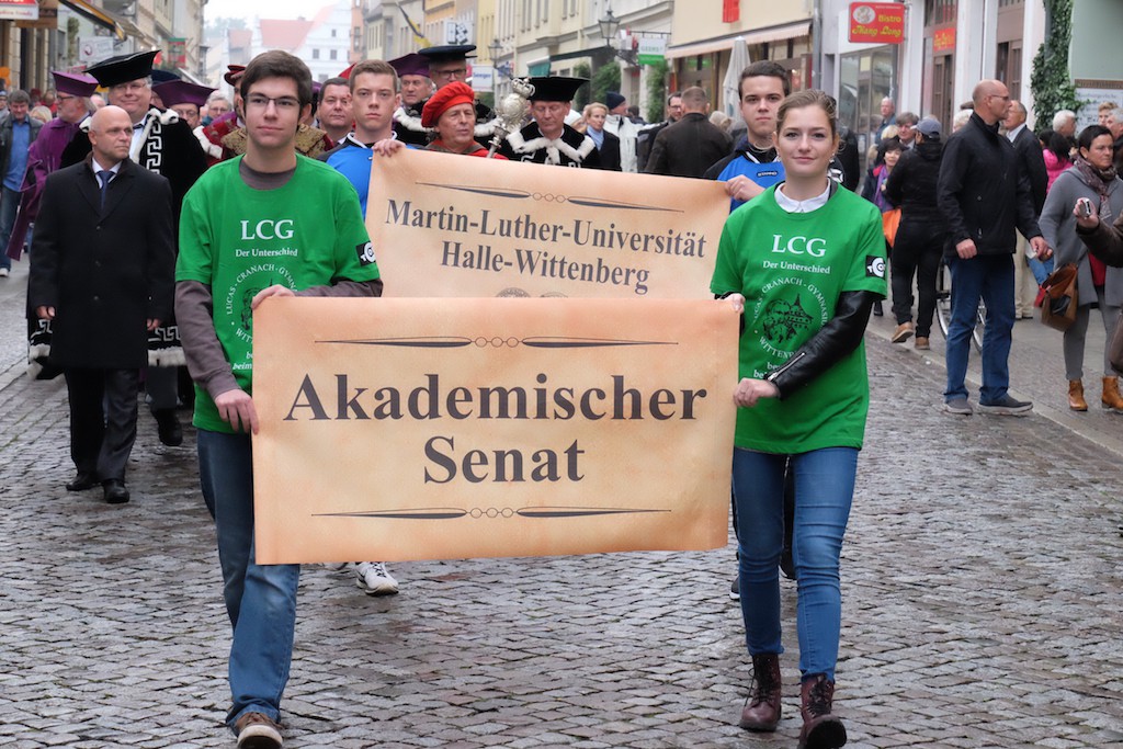 Schüler der beiden Wittenberger Gymnasien führten den Umzug des Senats der Martin-Luther-Universität Halle-Wittenberg vom historischen Rathaus zur Leucorea an. Diese Ehre wurde den Schülern in diesem Jahr zum ersten Mal zuteil. Daraus könnte sich eine gute Tradition entwickeln.