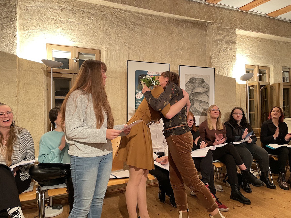 Aber auch wir hielten einige Überraschungen parat: Anika Würz, Autorin der ersten Generation der Schreibwerkstatt und Gründungsmitglied der „Stunde Null“ im Jahr 2008 ließ uns an ihren neusten Texten teilhaben. Mittlerweile hat sie ein abgeschlossenes Journalistik- Studium in der Tasche, aber auch das Schreiben fiktionaler Stoffe gehört noch zu ihrem Repertoire.