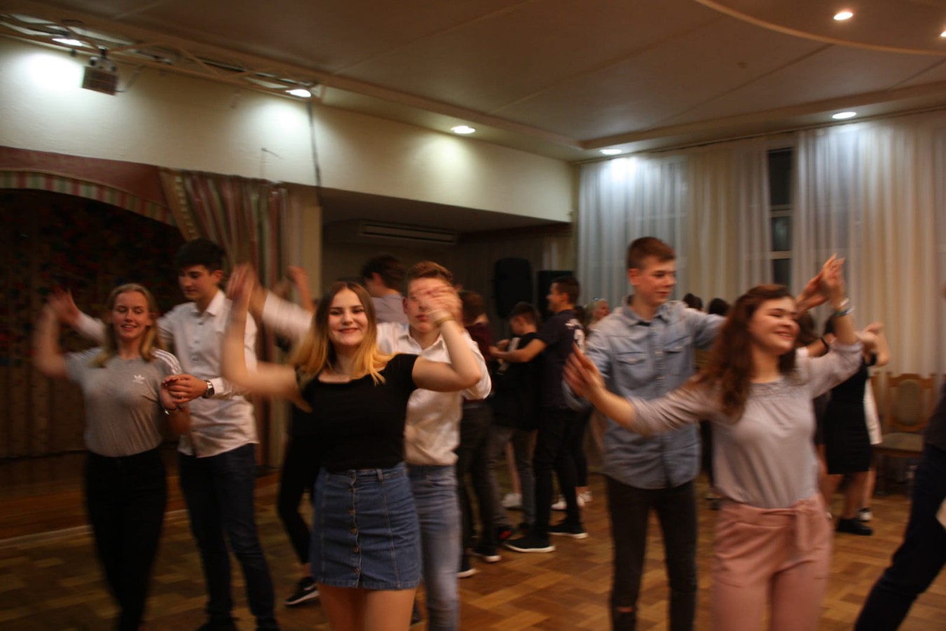 Am zweiten Tag fuhren wir nach dem Frühstück im Kulturpalast zur kunstorientierten Schule No.9, von welcher wir traditionell mit dem „Tanz der Störche“ und salzigem Brot empfangen wurden. Nach einer Schulführung mit mehreren Stationen, wobei uns eigene Werke gezeigt wurden, unter anderem Hüte mit selbsthergestelltem Stoff, wurden wir in zwei Gruppen geteilt und durften einerseits am Russischunterricht der zehnten Klassen und andererseits am Unterricht der russischen Literatur teilnehmen. Anschließend fuhren wir zurück in den Kulturpalast, wo uns eine Tanzstunde mit Polka und Wiener Walzer erwartete. Nach diesem amüsanten Zusammensein erhielten wir von dem Priester Georgi einen Einblick in eine katholische Kirche und erfuhren zudem viel über die Geschichte Weißrusslands zu Stalins Zeit sowie seinen Umgang mit Gläubigen. Im Anschluss, wieder im Kulturpalast angelangt, probten wir nochmals intensiv für unseren großen Auftritt auf der Bühne in der Show anlässlich des zwanzigjährigen Bestehens der Tanzgruppe ALEXIS. Mit großer Begeisterung genossen wir das Programm der talentierten Tänzer und Tänzerinnen sowie Sängerinnen. Der krönende Abschluss des ereignisreichen Tages war das jährlich stattfindende „Вечер дружбы“ („Abend der Freundschaft“). Dabei wurden bereits bestehende Freundschaften gepflegt und neue mit weißrussischen Jugendlichen geknüpft.